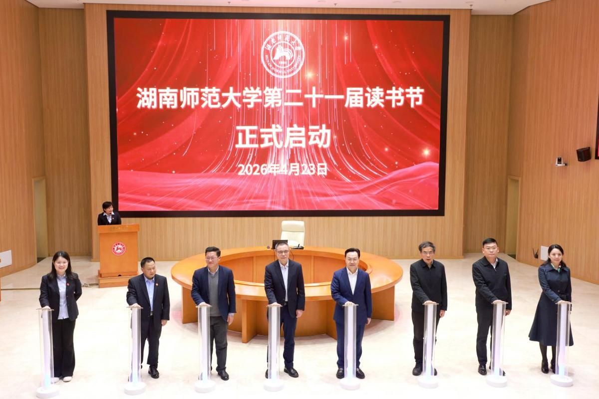 与会领导嘉宾共同点亮读书节活动启动柱,湖南师范大学第二十一届读书节正式拉开帷幕。
